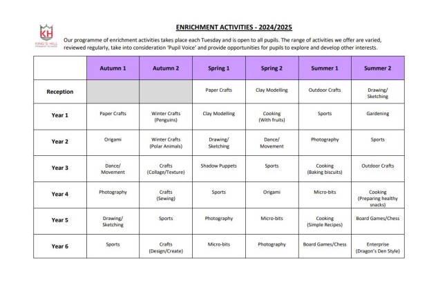 Here at King's Hill, we offer our children the opportunity to engage in a wide variety of Enrichment Activities. These are held on Tuesdays after school and are open for all to attend. The children really enjoy taking part in these extra-curricular, creative, cultural, enrichment activities.